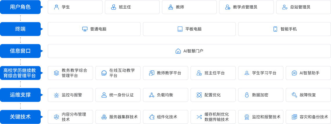 网梯高等学历继续教育综合平台由”教务管理“、”教学管理“两大核心系统和一套完备的”支撑辅助系统“组成。满足教师、学生、总站管理员、教学点管理员、班主任、学员管理员等各类用户的使用。