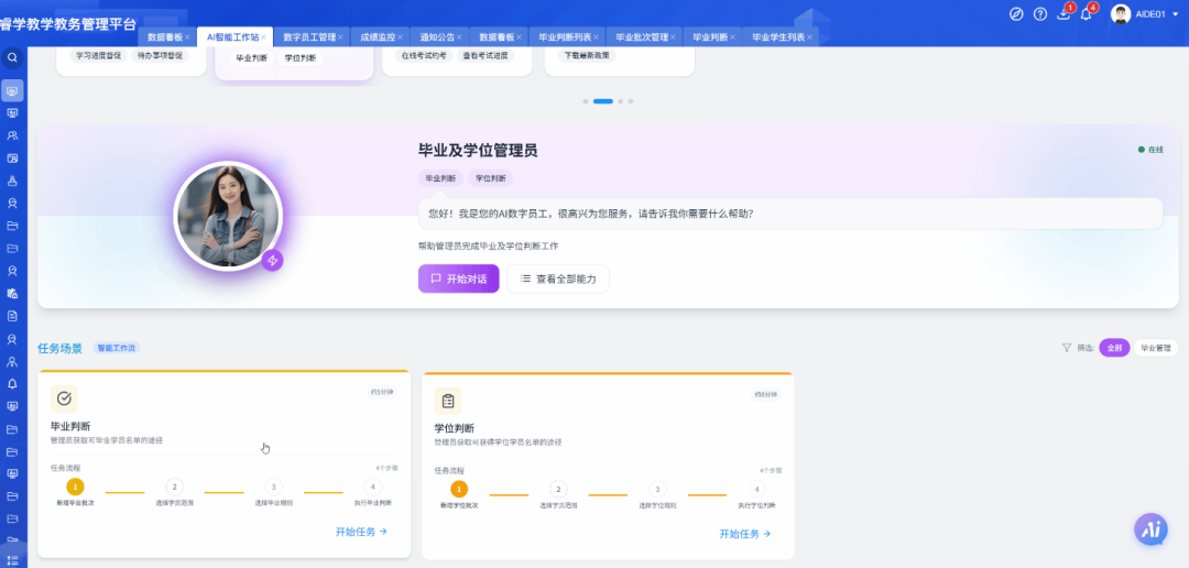 毕业及学位管理员是专为毕业流程打造的智能体,擅长“毕业判断”和“学位判断”,在TA的帮助下,老师们将从繁琐重复性工作中一键解绑,回归“专业主场”。