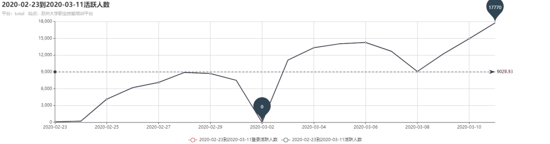 平台活跃人数统计 自2月24日开始,防疫平台的学习活跃人数呈线性增长。并于发文昨日达到目前的最大值(17770人),防疫平台在性能承载方面表现良好,网梯公司将针对平台进行持续监控,保障未来更多人数的学习性能稳定。
