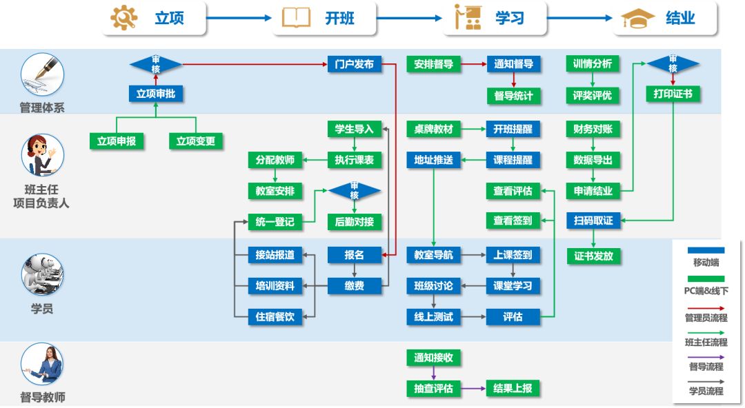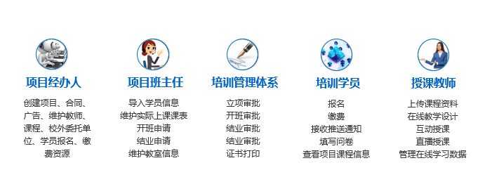 系统业务流程及角色职能分配 本系统包含项目负责人、项目班主任、办学单位管理员、继续教育学院培训管理员、教师、督导专家、学员、超级管理员。下方为教培产品配置的通用角色功能对照表,具体可根据将来培训业务的需要,通过设置权限,灵活配置更多角色。 管办分离培训管理信息化系统业务流程涵盖培训项目立项审批、开班过程管理、学员学习过程管理及结业管理等培训综合管理过程。系统支持多终端搭配使用(PC端、微信端)。 系统功能模块介绍 01 教务管理:角色、院系、教师、教室、课程、委托机构、合作单位、督导员、支出、课酬 02 业务流程配置:各个院系的立项、合同、补充合同、开班、结业的审批流程与审批角色配置 03 立项管理:培训性质、合作机构、合同、广告、收费、计划课表、证书、班主任、项目负责人 04 班务管理:学员管理、缴费管理、执行课表管理、师资管理、开班申请、上课通知、签到管理 05 学员空间:签到、评估、课程表、通讯录、订单管理、证书查询、接收通知、在线报名、缴费 06 培训质量管理:课程督导、项目评估、课程评估、教师授课水平综合评估排名、课程质量综合评估排名 07 结业管理:财务对账、部分学员结业、证书打印、二维码校验真伪、扫码取证 08 训情分析:费用分析,资源使用分析,评估分析,学员信息分析,审批分析,委托单位分析 平台核心技术特色