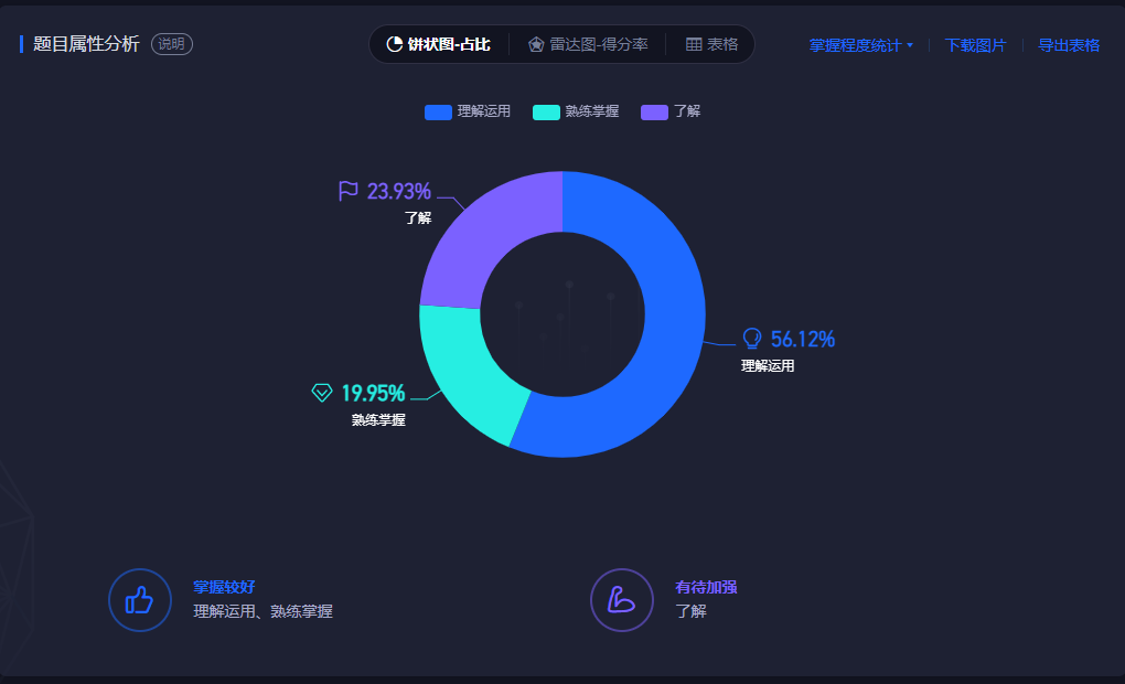 支持雷达图模式查看题目所属知识点得分率分析,找到优势和薄弱知识点,有效助力教师实现精准教学。