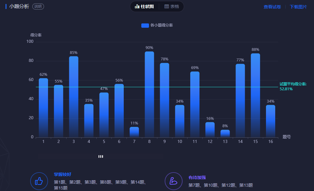 试卷是考试运行的真正载体,而试卷分析的核心是对试题的探究,除了对每份试卷(一场考试可能有多份试卷)统计平均分、最高分、最低分、标准差等基础指标,大数据智能化分析功能还统计了难度系数、难度比例、信度、区分度等高阶量化指标。试卷难度是评估试题质量最重要的指标,直接影响考试分数的分布形态和离散程度;信度是反映考试结果稳定性、可靠性的指标,信度高的试卷受随机因素影响较小;区分度表示试题对考生能力的区分程度,判定试题能否把学习上优秀与较差的学生区别开来的指标。