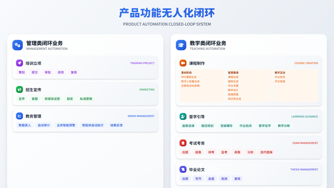 如果说 2024年我们谈的是“场景+赋能”——AI深度嵌入岗位、辅助老师与管理者;那么 2025年的关键词就是“闭环+无人”——一个个智能体协作成体系,真正跑通业务闭环。
