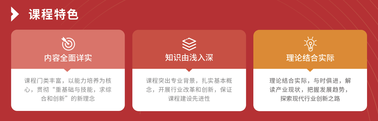 平台课程内容全面详实,贯彻“重基础与技能,求综合创新”的理念,扎实基本理念后开展行业改革和创新,将理论与 实际相结合,使知识由浅入深,与时俱进,保障课程建设的先进性。