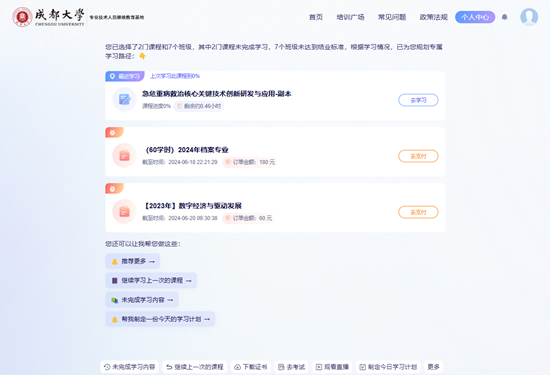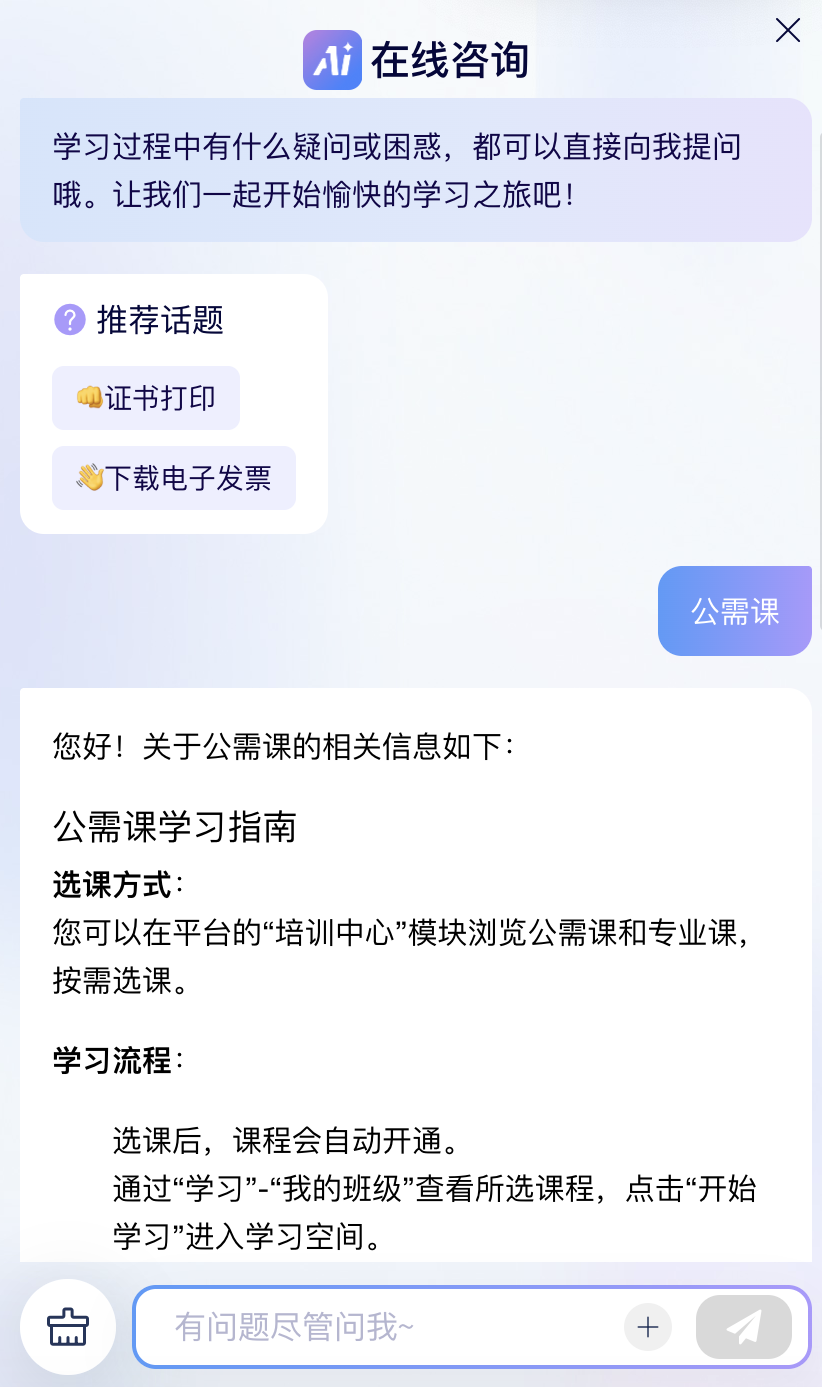 摒弃传统 “搜索——点击” 模式,以对话式引导精准推送“待完成课程、即将截止考试、失效订单”,让学习更具针对性。