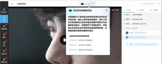 AI智能总结助手支持课前试听、学习引导、智能总结、学习轨迹记录、断点续学等主流功能,还能自动总结视频内容,提炼视频课程关键内容与时间节点,大幅节省学员学习时间。