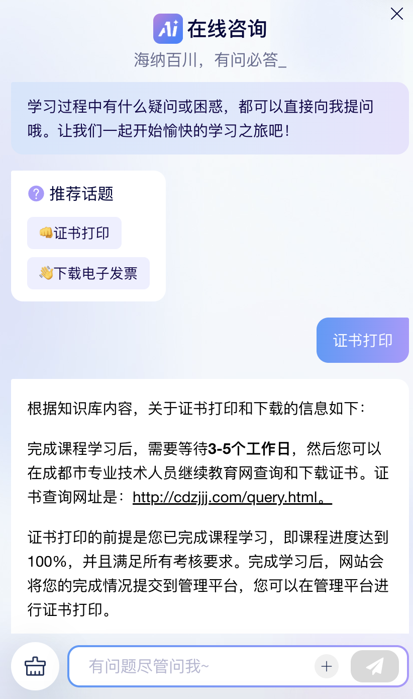 配备7×24小时在线客服、学习交流群等多元素支持。以AI赋能客服智能化,提高客服效率,为学员提供更优质的服务。