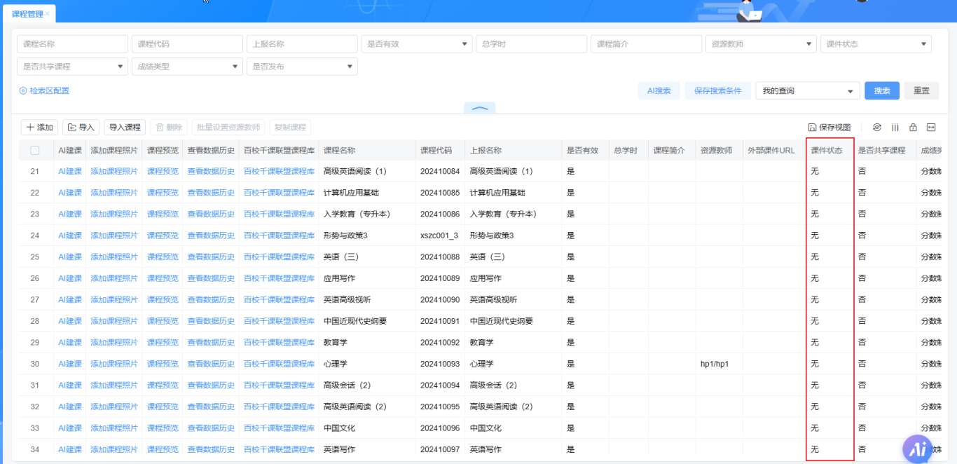 课程管理列表新增“课件状态”列,系统自动识别教学设计状态,直观展示课程资源情况,后续管理无需反复核对,省时又精准。