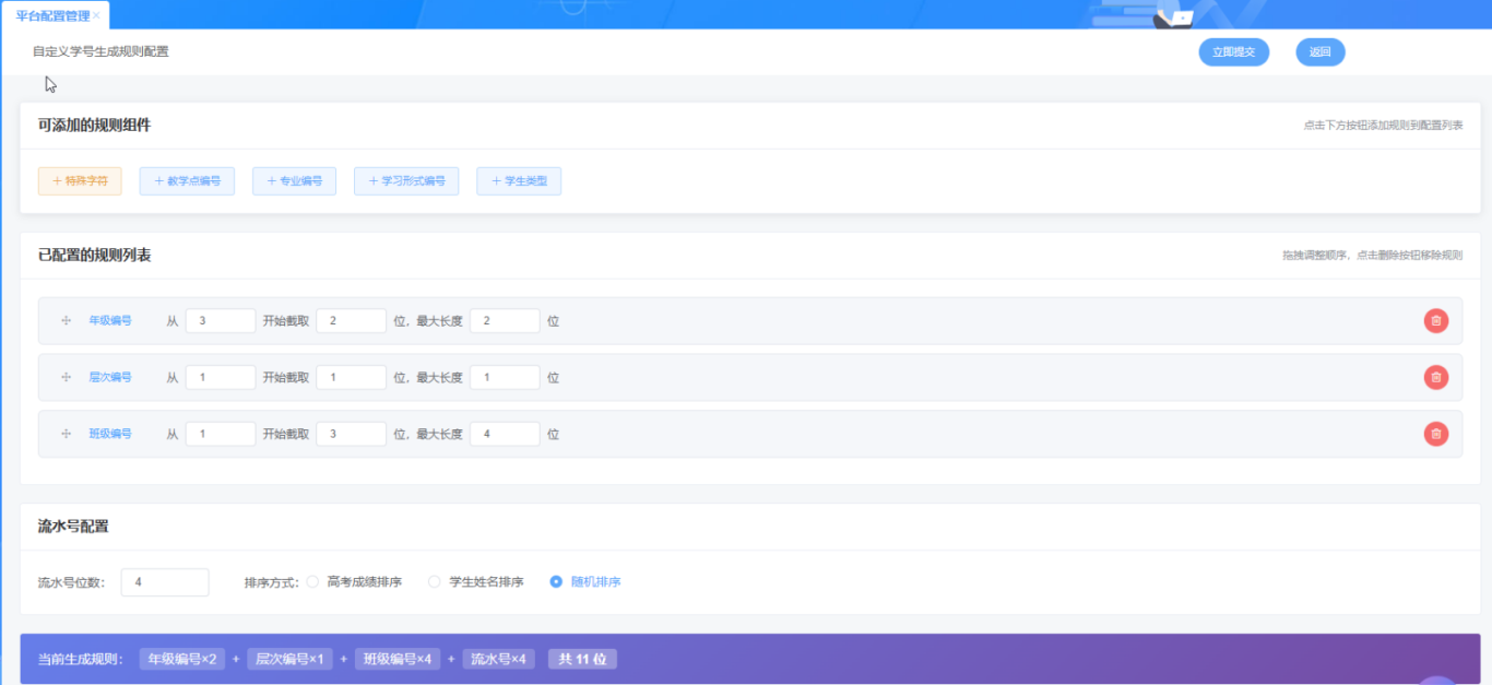 配置管理开放“自定义学号生成规则配置 ”功能,可添加教学点、专业、学生类型等规则组件,自由调整排序和截取位数,流水号排序方式多样选择,学号一键生成,适配不同管理需求。