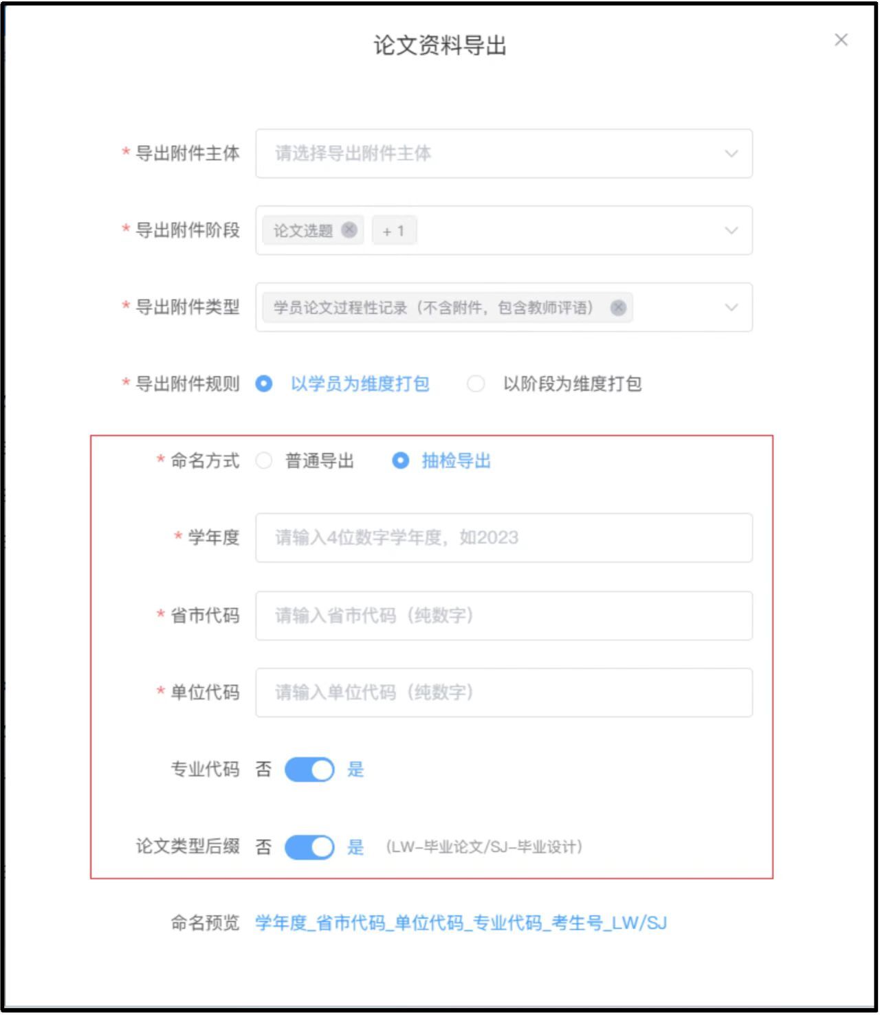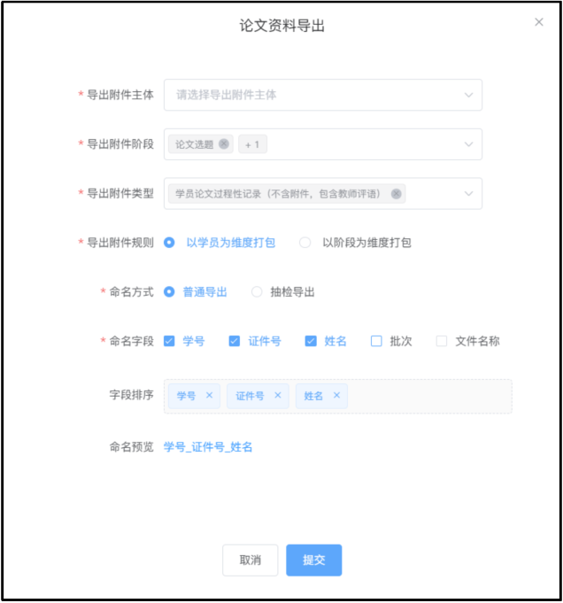 新版论文支持普通导出和抽检导出双模式:普通导出可自定义命名字段及排序,学号或证件号必选其一。