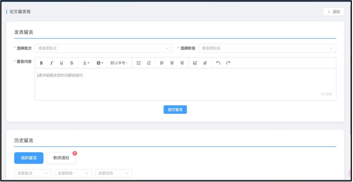 学生可选择批次,选择阶段,输入留言内容,对应的指导教师即可看到留言内容,还能查看教师通知并进行回复。所有沟通记录集中留存、可查可溯,让论文指导更顺畅。