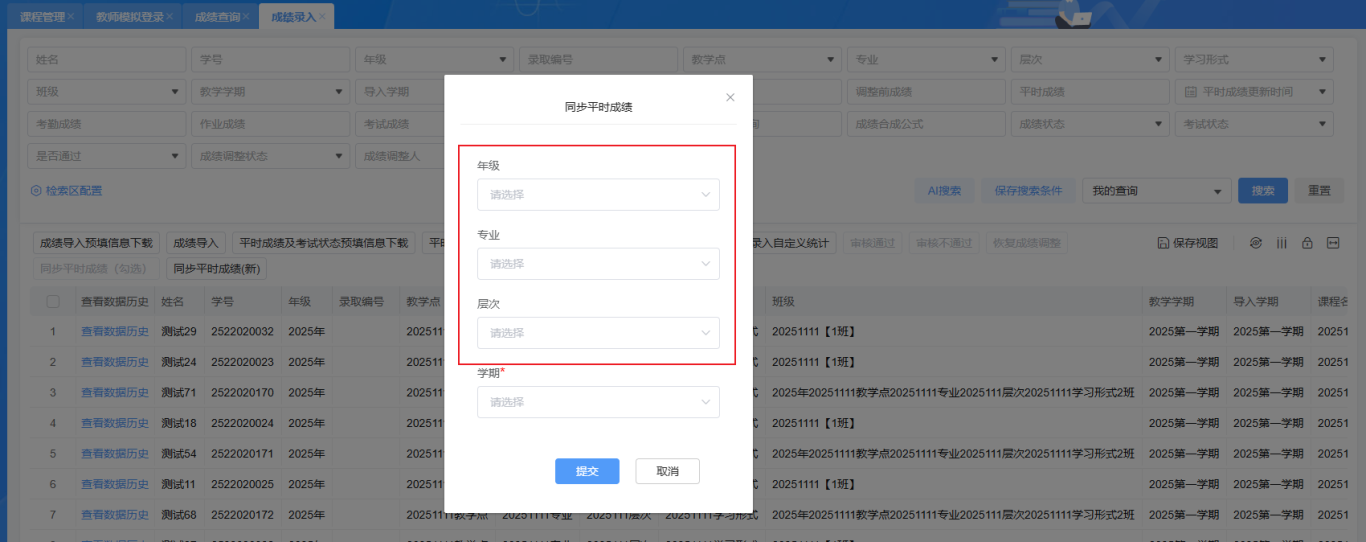 同步平时成绩支持年级、专业、层次框定范围,批量操作更精准,避免重复筛选。