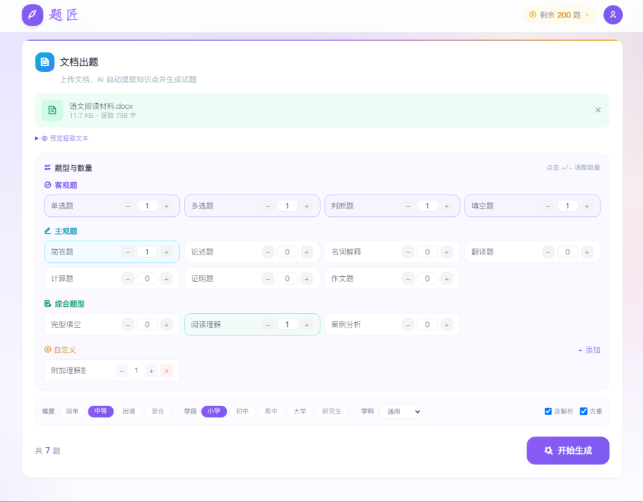 手头有教材 PDF 或课件?直接上传。题匠会自动分析文档内容,AI 就能从文档中精准提取知识点并生成对应试题。