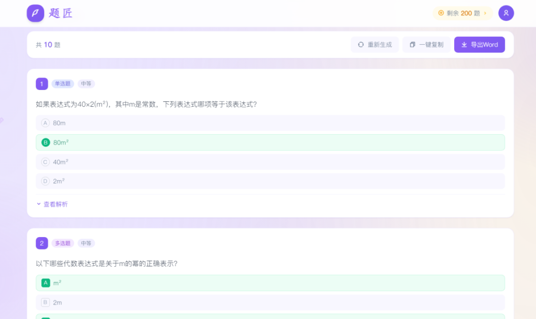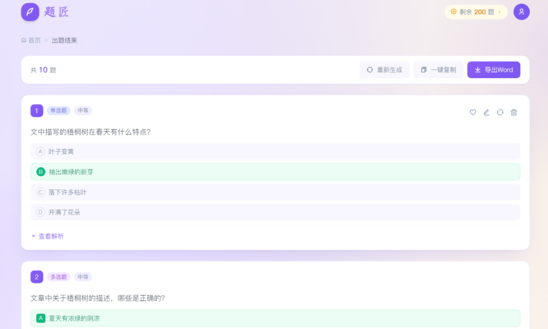 生成的每道题都附带详细解析,支持一键复制、导出 Word、收藏、编辑、换一题、删除等操作,完全按你的节奏来。
