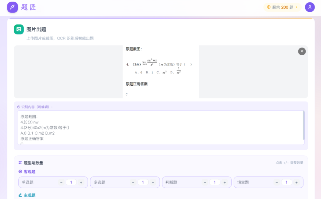 看到一段不错的教材内容?拍张照片上传,题匠通过 OCR 识别图片文字,再由 AI 分析生成题目。